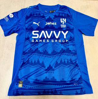 Camisola do Al-Hilal, tamanho L. Apresenta um design vibrante em azul com detalhes gráficos. - Logo no peito. - Escudo do Al-Hilal. - Nome Savvy Games Group estampado. - Tecnologia Drycell.