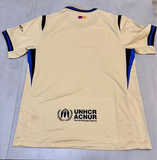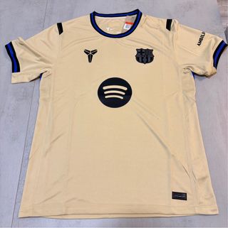 Camisola alternativa do FC Barcelona. - Cor bege com detalhes em preto e azul. - Escudo do clube e logótipos aplicados. - Design inspirado em Kobe Bryant.