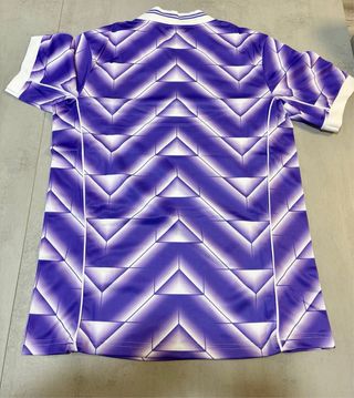 Camisola de futebol do Real Madrid, com um design vibrante em roxo e branco. - Logo da Adidas bordado. - Escudo do Real Madrid bordado. - Tamanho L
