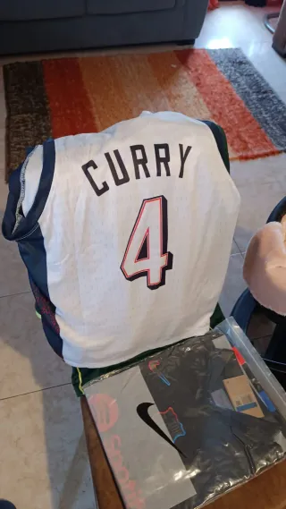 Conjunto de equipamento de basquetebol para criança. - Camisola branca com USA e número 4. - Bandeira dos EUA na camisola. - Detalhes em azul e vermelho. - Inclui calções pretos com logótipo Nike.