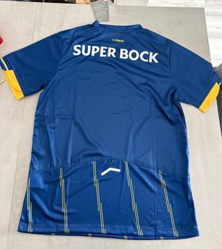 Camisola especial do FC Porto, edição de 15 anos, em tamanho L. Uma peça de colecionador. - Cor azul com detalhes amarelos. - Logo do FC Porto no peito. - Patrocínio Betano na frente. - Logo da New Balance. - Tecnologia NB DRY.