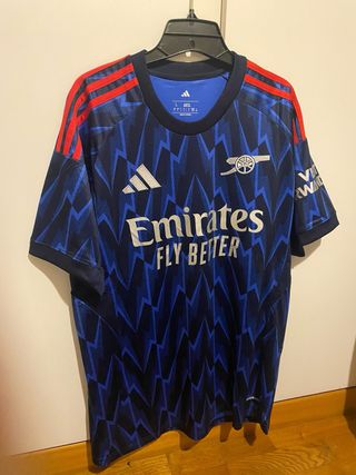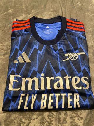 Camisola oficial do Arsenal com o patrocinador Emirates Fly Better. - Design com padrão geométrico azul e azul marinho. - Detalhes em vermelho nas mangas. - Logo da Adidas e emblema do Arsenal. - Tamanho L