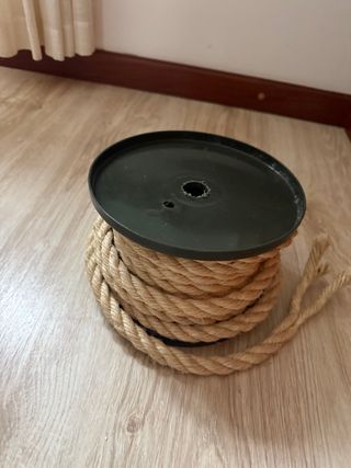 Corda grossa enrolada num carretel. - Material de corda resistente. - Carretel de plástico preto.