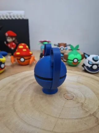 Item colecionável em formato de Poké Ball, com design de campeão. - Cor principal: azul. - Detalhe: estrela dourada no topo. - Base de apoio azul.
