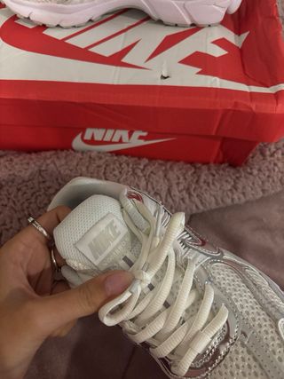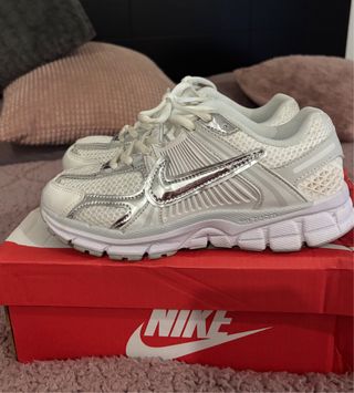 Tênis Nike Zoom Vomero em branco com detalhes prateados. - Design moderno e esportivo. - Swoosh Nike em destaque. - Solado com tecnologia Zoom Air. tamanho 37