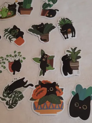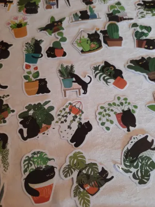Conjunto de 50 adesivos com adoráveis caricaturas de gatos pretos. Perfeitos para decorar cadernos, agendas ou qualquer superfície. - Design divertido e único. - Tema: gatos pretos e plantas.