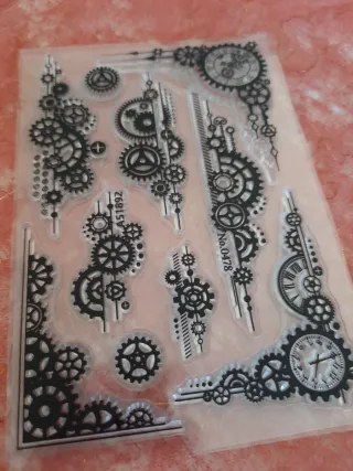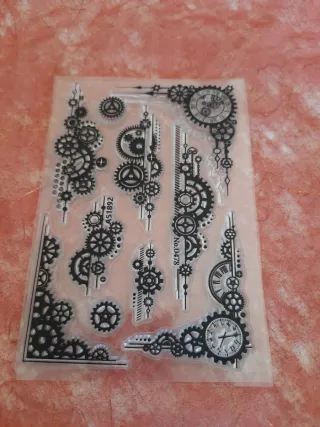 Conjunto de carimbos com tema industrial steampunk, perfeito para projetos criativos. - Design com engrenagens e relógios. - Ideal para scrapbooking e artesanato. - Material em borracha e acrílico.