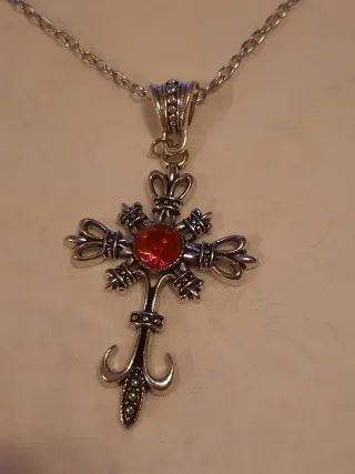 Colar com pingente de cruz em estilo gótico, com acabamento prateado e detalhes vintage. A peça central é adornada com uma pedra vermelha vibrante. - Design intrincado com elementos decorativos. - Pedra central vermelha. - Acabamento metálico prateado.
