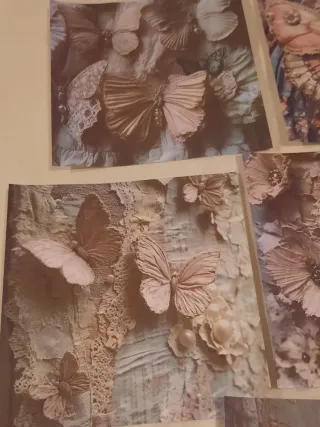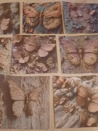Conjunto de 8 gravuras com delicadas composições de rendas e borboletas. - Design vintage e romântico. - Detalhes em relevo. - Tons pastel suaves. W1/1