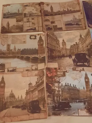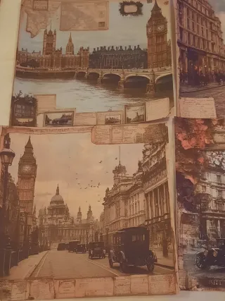 Conjunto de 12 cenários com temática retro de Londres, destacando a icónica Torre Big Ben. - Estilo vintage. - Representações de cenários londrinos. W1