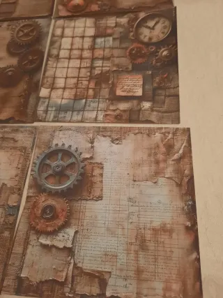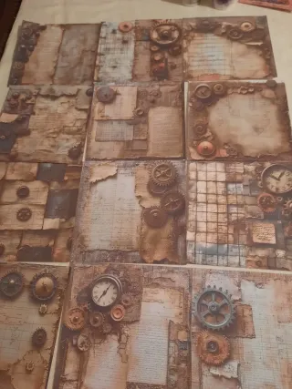 Conjunto de 12 papéis com temática steampunk, perfeitos para trabalhos de scrapbooking e artesanato. - Tamanho: 15x15cm. - Design com gravuras e elementos de composição steampunk. - Ideal para projetos criativos.