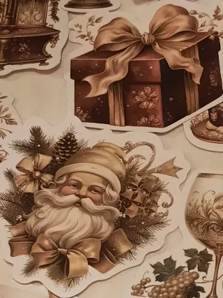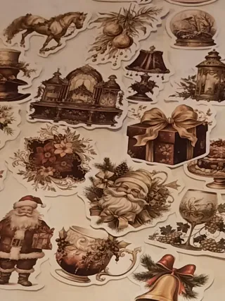 Conjunto de 20 autocolantes com tema de Natal. - Novos, tons dourados. - Design vintage com cenas e figuras natalícias. - Inclui elementos como cavalos, delicias de doces, presentes e Pai Natal. - Ideal para decoração temática.