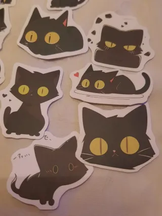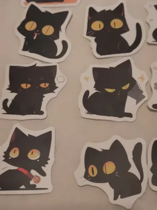 Conjunto de 50 autocolantes com caricaturas de gatos pretos em estilo cartoon. Perfeitos para decorar cadernos, agendas ou qualquer superfície. - Design divertido e original. - Variedade de poses e expressões dos gatos.