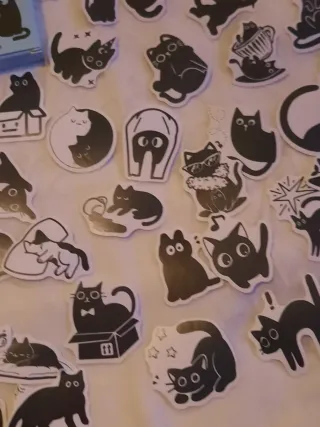 Conjunto de 46 autocolantes com diversas ilustrações de gatos pretos em diferentes poses e estilos. - Design divertido e variado. - Ideal para personalizar cadernos, agendas ou outros objetos.