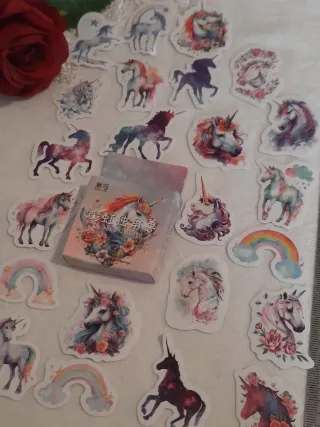 Conjunto de 46 autocolantes com o tema de unicórnios e elementos fantásticos. - Caixa 23 modelos x 2 unid - Inclui diversos desenhos de unicórnios. - Contém também arco-íris e flores. - Ideal para decorar cadernos, agendas ou outros objetos.