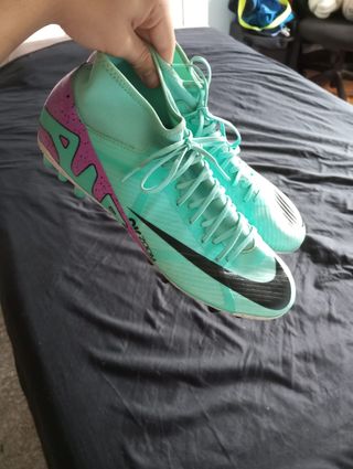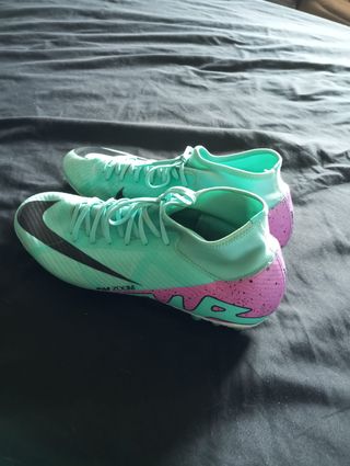 Tenho um par de chuteiras Nike Mercurial Superfly 9 Academy para venda. Estão em ótimo estado, com uma cor verde-água vibrante e detalhes rosa. - Modelo: Nike Mercurial Superfly 9 Academy - Cor: Verde-água e rosa - Tamanho: (Adicione o tamanho aqui) - Tipo: Chuteiras de futebol