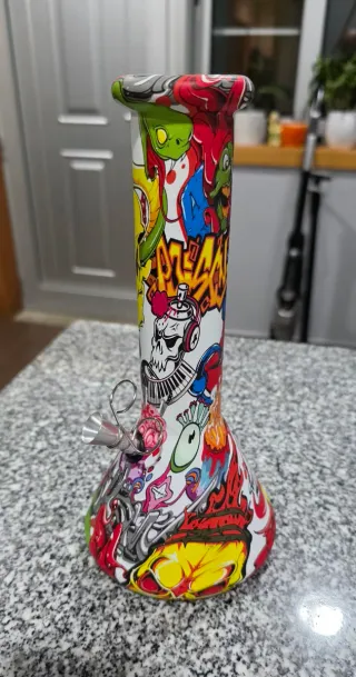 Bongo com um design vibrante e cheio de arte graffiti. - Estampa colorida com caveiras, cobras e elementos urbanos. - Formato ergonômico para uso confortável. - Material resistente e durável.