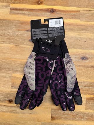 Luvas Oakley Factory Pilot para ski ou snowboard. - Tamanho L. - Design com padrão camuflado e detalhes em roxo. - Punho em tecido preto.
