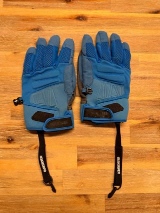 Luvas Quiksilver em azul, tamanho M, ideais para ski ou snowboard. - Material resistente. - Tiras de ajuste no pulso. - Cordão de segurança com mosquetão.