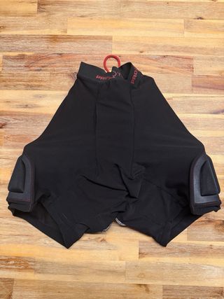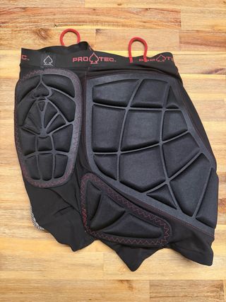 Proteção acolchoada da marca Protec, tamanho M. - Design com acolchoamento segmentado para maior flexibilidade. - Tecido preto com costura vermelha. - Alças de fixação vermelhas no cós.