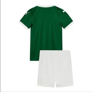 Kit infantil do Palmeiras para a temporada 25/26, nas cores verde e branco. - Camisa com gola V e detalhes em branco. - Shorts com escudo do time e logo da Puma.
