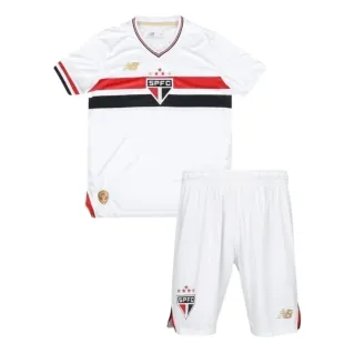 Kit infantil do São Paulo para a temporada 25/26, na cor branca. - Camisola com detalhes em vermelho e preto nas mangas e gola. - Emblema do clube e logo da New Balance. - Calções com emblema do clube e logo da New Balance.
