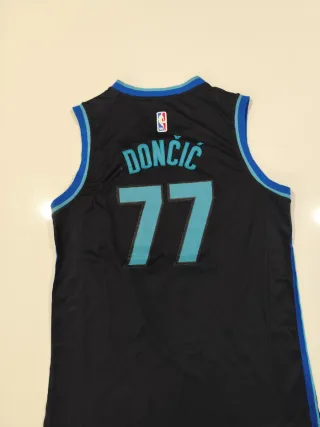 Camisola da NBA da equipa Dallas Mavericks, número 77 - Luka Dončić - Cor preta com detalhes em azul. - Logo da equipa no peito. - Design sem mangas.