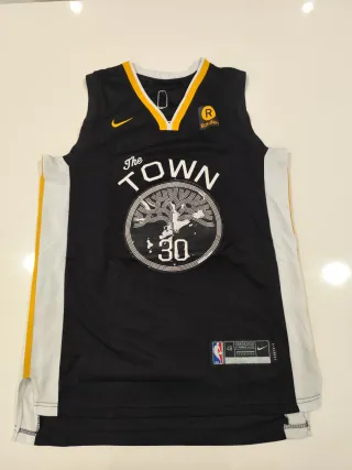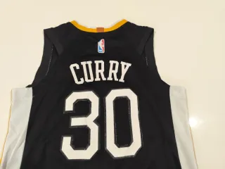 Camisola da NBA do jogador Stephen Curry, número 30. - Cor preta com detalhes em dourado e branco. - Logo da NBA visível.