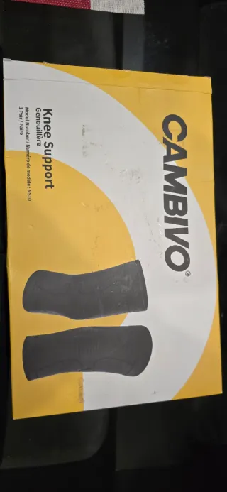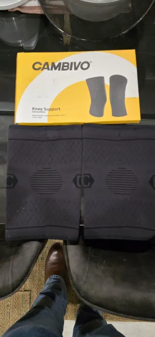 Par de suporte para joelhos da marca Cambivo, tamanho L. São feitas de um material elástico e respirável. - Cor preta. - Design anatômico. - Padrão texturizado.
