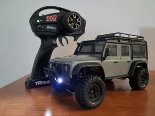 Carro de controle remoto Traxxas TRX4M. - Modelo Defender. - Inclui controle remoto TQ 2.4GHz. - Pneus off-road. - Luzes de LED frontais. Servo injora e opcionais injora Kit de rolamentos no carro todo Alargadores de rodas Upgrade de servo Diferenciais de metal completos Com caixa original e com as peças substituídas por opcionais