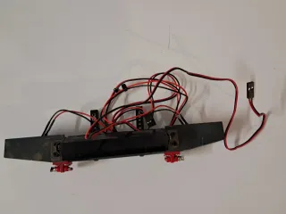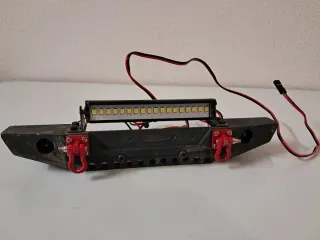 Para-choques de substituição para o Traxxas TRX4 com barra de luz LED integrada. Um led não funciona. - Barra de luz LED com 20 LEDs. - Ganchos de reboque vermelhos. - Construção em metal resistente. Kit de parafusos e porcas incluídos