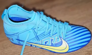 Chuteiras de futebol para criança em azul vibrante. Tamanho 38,5 Esta chuteira é a Nike Mercurial Superfly 9 Club KM FG/MG, pertencente ao "Motivation Pack" e inspirada no jogador Kylian Mbappé. Este modelo de cor "Baltic Blue" destaca-se pelo grafismo "Swoosh" em estilo banda desenhada na lateral e foi concebido para proporcionar velocidade e precisão em campos de relva natural e artificial.
