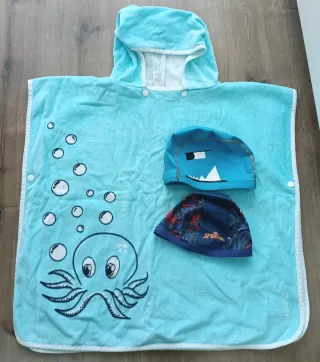 Conjunto de toalha de piscina com capuz e duas toucas. - Toalha azul com estampa de polvo e bolhas. - Uma touca azul com estampa de monstro. - Uma touca azul escura com estampa do Homem-Aranha.