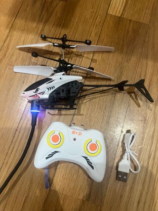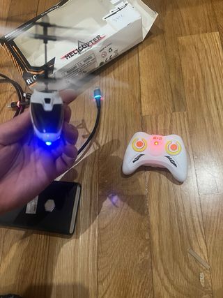 Helicóptero RC para o interior. Possui um comando que apenas tem a função on/off e subir. A movimentação é controlada através da mão.