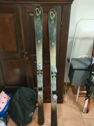 Vendo esquís de mujer K2 modelo T:Nine "True Luv". Son unos esquís muy ligeros y fáciles de manejar, perfectos para quien busca su primer equipo económico. Cotas: 118 / 74 / 103 mm. Longitud: 167 cm (ideales para una estatura entre 1,65 m (intermédio/avançado) y 1,75 m(iniciante). Radio de giro: 15 m. Fijaciones: Marker integradas. Tienen un flex suave, lo que los hace excelentes para mujeres y para nieve primavera o nieve blanda. Solo los esquís para venta, no vendo botas ni bastones.