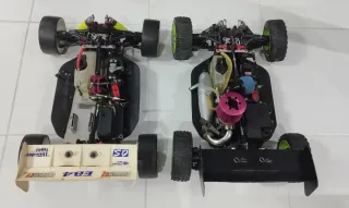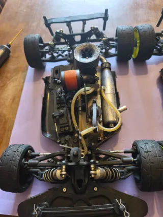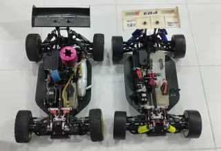 Conjunto de coche completo más chasis de thunder tiger EB4 S2 y S2.5 con un motor thunder tiger pro 21 con tirador. El chasis lleva también servos y bancada de motor con altura baja para montar un motor con posibilidad de arranque con mesa. Incluyo dos emisoras y sus respectivos receptores y unos muelles para cambiar dureza de amortiguadores. Lo coches están usados y el motor se paró funcionando hace unos seis meses que se paró y está con aceite after run para su mantenimiento. Se vende todo junto No leer thunder tiger, team magic, team Durango, mugen, tsmiya, Kyosho, agama, TLR, losi, RC , nitro, RC nitro, chasis, servo, motor rc