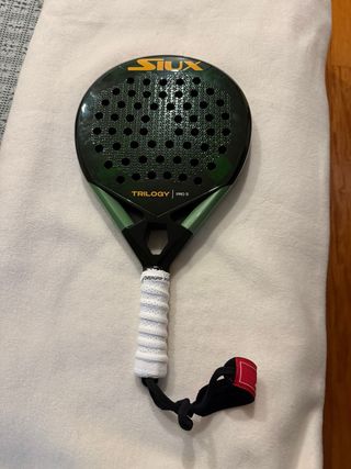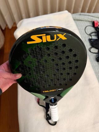 Raquete de padel Siux Trilogy Pro 5 com design moderno. - Cor principal preta com detalhes em verde e amarelo. - Superfície com furos. - Cabo com overgrip branco.