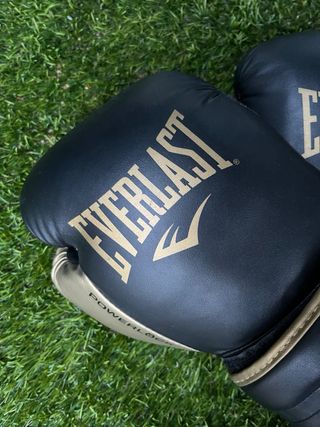 Luvas de boxe Everlast Powerlock em preto e dourado. - Design moderno e elegante. - Fecho de velcro para ajuste seguro.