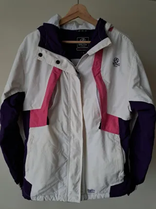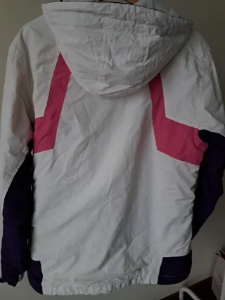 Blusão de alta qualidade, ideal para atividades ao ar livre ou desportos de neve. Combina funcionalidade com um design moderno. Ótimo estado. Divisões para várias funcionalidades. - Cor principal branca com detalhes em roxo e rosa. - Capuz integrado. - Fecho frontal completo. - Bolsos laterais com fecho. - Extensão no punho para a mão.