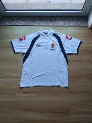 Polo oficial del Real Zaragoza de la marca Lotto. Ideal para coleccionistas o aficionados del equipo. - Color blanco con detalles en azul marino y detalles en celeste. - Logo de Lotto bordado en el pecho. - Escudo del Real Zaragoza bordado en el pecho. - Inscripción Pikolin en el pecho. - Logo de Lotto en las mangas.