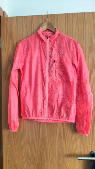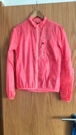 Casaco corta vento em tom rosa vibrante, com um padrão subtil. - Fecho frontal completo. - Bolso com fecho no peito. - Punhos elásticos. Tamanho S