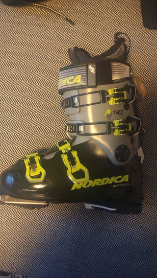 Botas de ski Nordica Strider 130 PRO em cinza e preto com detalhes em amarelo. - Fecho com fivelas. - Design moderno.