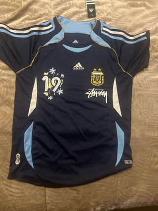 Camisola vintage da Argentina com design Stussy. - Cor azul marinho. - Detalhes em azul claro e dourado. - Número 19 com flores. - Logo da Adidas e da Argentina.