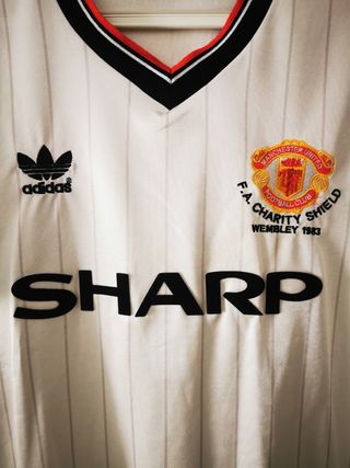 Camisola Manchester United Época 1983 F. A Charity Shield Wembley 1983 Tamanho: Mostra 2xxl mas veste L Cor: Branco Pérola Marca: Adidas Usada uma vez.