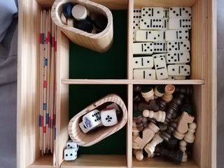 Damas, Dominó, Xadrez, Micado, Gamão e Poker de dados. Em madeira ideal para jogar em família e com amigos.