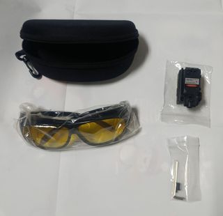 Kit de acessórios para airsoft. - Óculos de proteção com lentes amarelas. - Mira laser compacta. - Mala de transporte preta. - Chaves Allen para ajuste.
