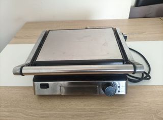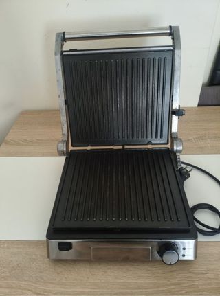 Grelhador de 2000W com regulador de temperatura. Está em bom estado, com alguns sinais de uso. - Potência: 2000W - Controlo de temperatura - Placas de grelhar em aço inoxidável