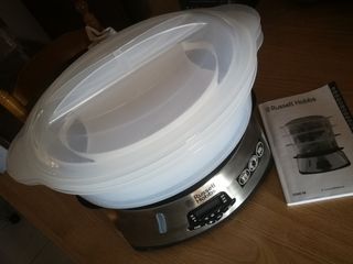Máquina de cozer a vapor / Vaporeira da Russell Hobbs como nova. Usada 4x. Completa com todos os acessórios e fatura (comprada em Março/2023). Grande capacidade (10,5L) e 1000W. De fácil utilização, muito intuitiva e permite cozinhar vários alimentos diferentes em simultâneo. Com cesto para cozer arroz. Em aço inoxidável. Preço original 71,55€.