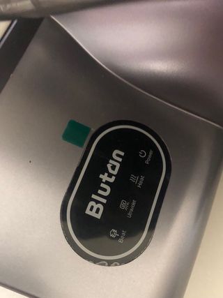 Aspirador de pó com design moderno e acabamento em cinza e azul. - Recipiente transparente para visualização do conteúdo. - Botões de controle azuis. - Detalhes em azul no recipiente e na base.