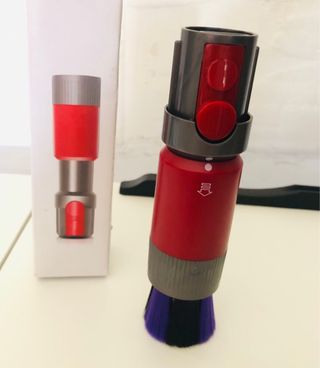 Tubo de extensão telescópico para aspirador Dyson. Peça de substituição ou acessório adicional. - Design telescópico ajustável. - Cor vermelha e cinza. - Escova com cerdas roxas e pretas.